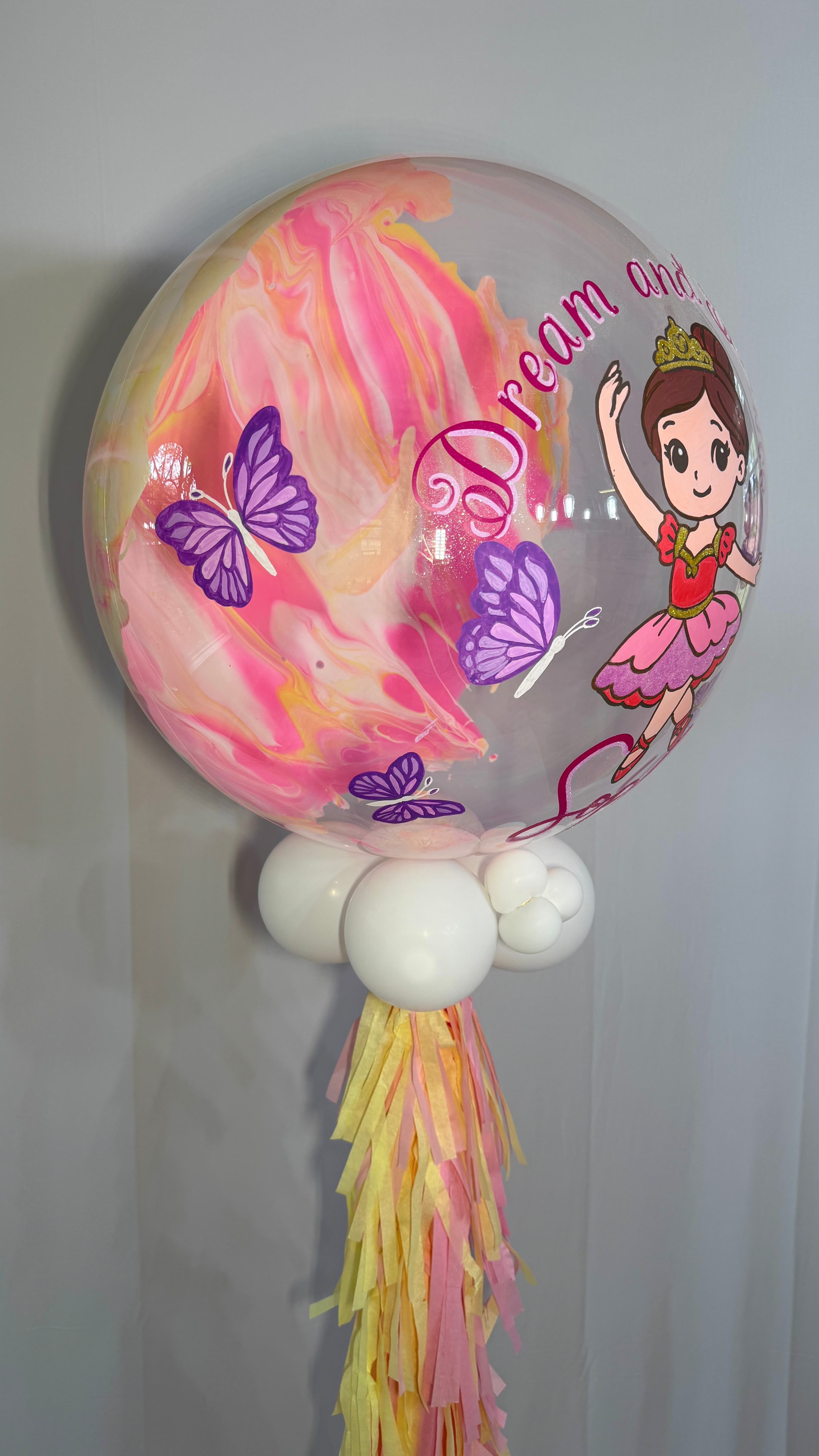 A stunning custom bubble balloon hand-painted inside to create a vibrant swirling background, and outside with a detailed ballerina figure. Features glitter accents on the letters, the dancer's outfit, and crown details — plus hand-painted butterflies throughout. Personalized with a name and custom phrase in vinyl and glitter. Every piece is one of a kind. From $110.